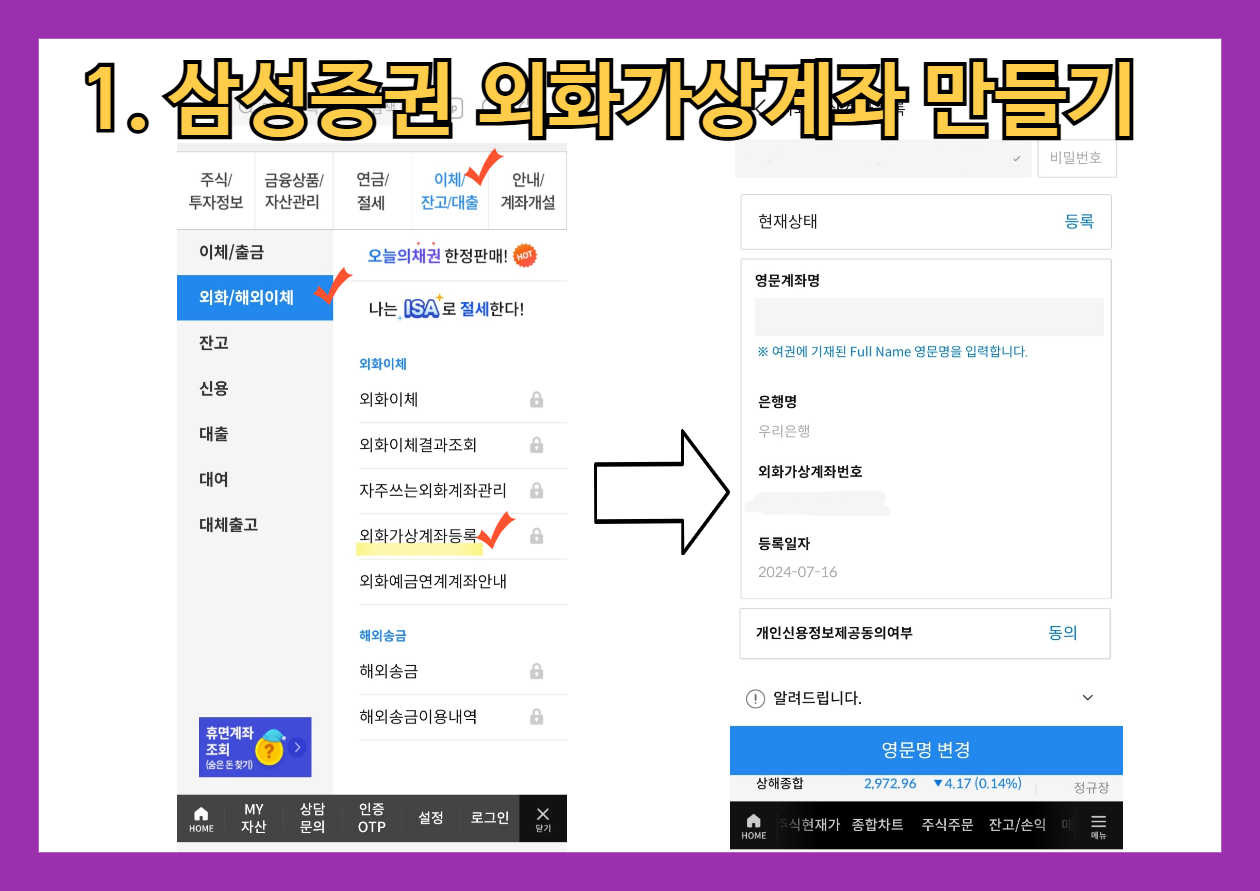 신한은행에서 삼성증권으로 송금하기 위해선 삼성증권에서 외화를 입금받을 가상계좌를 만들어야 합니다. 삼성증권 모바일에서 외화가상계좌등록 메뉴로 들어가면 본인의 여권상 영문명을 입력한 뒤 외화 가상계좌번호를 등록할 수 있습니다. 그러면 우리은행의 가상계좌번호가 생성되는 것을 볼 수 있습니다. 혹시 본인의 영문명이 틀리더라도 추후에도 변경할 수 있어요.