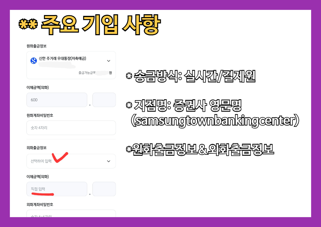 항목 기입/선택 송금방식 '실시간/결제원' 선택 받는 분 외화계의 지점명 'samsungtownbanking' 입력 원화출금정보 송금 수수료가 나갈 계좌 선택 외화출금정보 외화를 송금할 계좌 선택 ※ 삼성증권으로 외화 송금할 때 기준