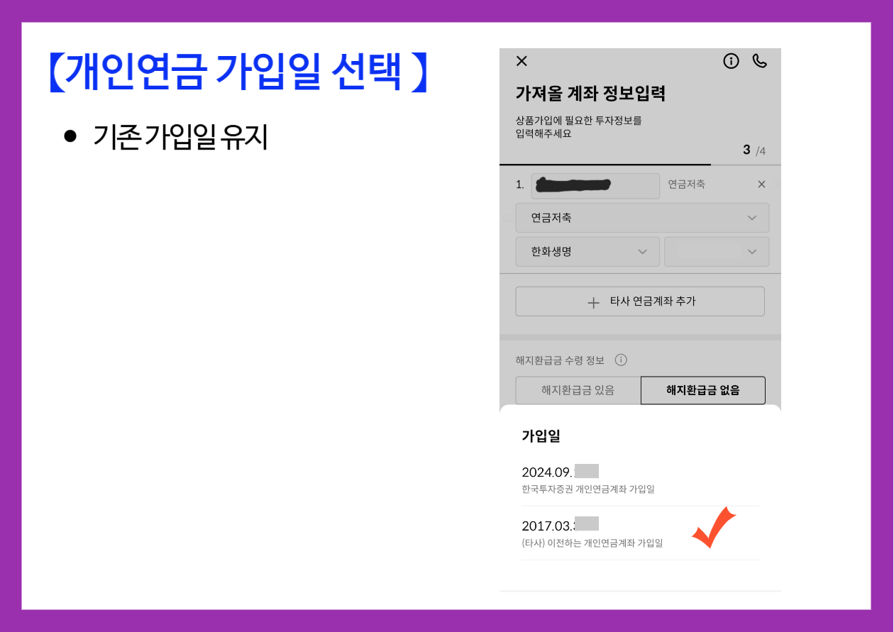 이전받을 개인연금 계좌를 선택했다면 가입일을 선택하게 된다. 기존 가입일을 유지할 것이므로 '(타사) 이전하는 개인연금계좌 가입일'을 선택했다. 그러면 계약 이전 신청이 완료되고 당일이나 다음날 보험사로부터 계약 이전을 할 것인지 확인 전화가 온다. 이후 신속하게 다음날 증권사로의 연금저축 이전이 완료되었다.