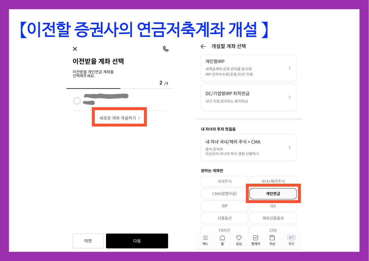 이전 받을 계좌를 선택하는 창이 뜨는데 계좌가 없다면 새로운 계좌를 개설해야 한다. 연금저축에 있는 돈을 옮기는 것이므로 원하는 계좌에서 '개인연금' 계좌만 새롭게 개설하면 된다.