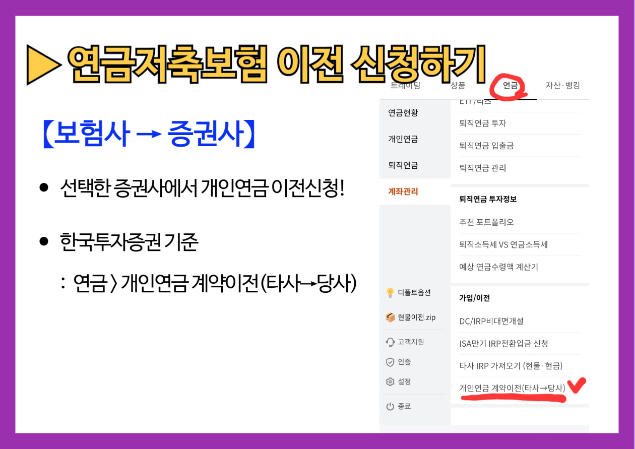 증권사에서 개인연금 계약 이전 신청→ 가입한 보험사에서 확인 전화 → 2~3일 뒤 증권사 계좌로 입금