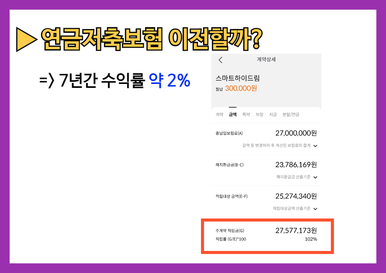 사회 초년생 때 지인으로부터 가입한 연금저축보험이 있다. 납입 기간이 10년인데 올해로 7년 차이다. 이제 3년만 더 납입하면 납입기간이 종료된다. 원금 손실의 위험이 없다는 점과 포트폴리오 관리에 신경을 쓰지 않아도 된다는 점이 연금저축보험의 장점이지만, 은행 예금도 3%대 이자를 주는 요즘 낮은 수익률에 성이 차지 않았다.